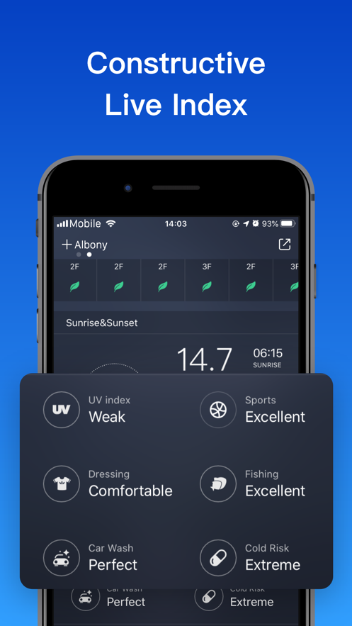 · Life index such as UV, sports, dressing, fishing, car washing, and susceptibility to colds